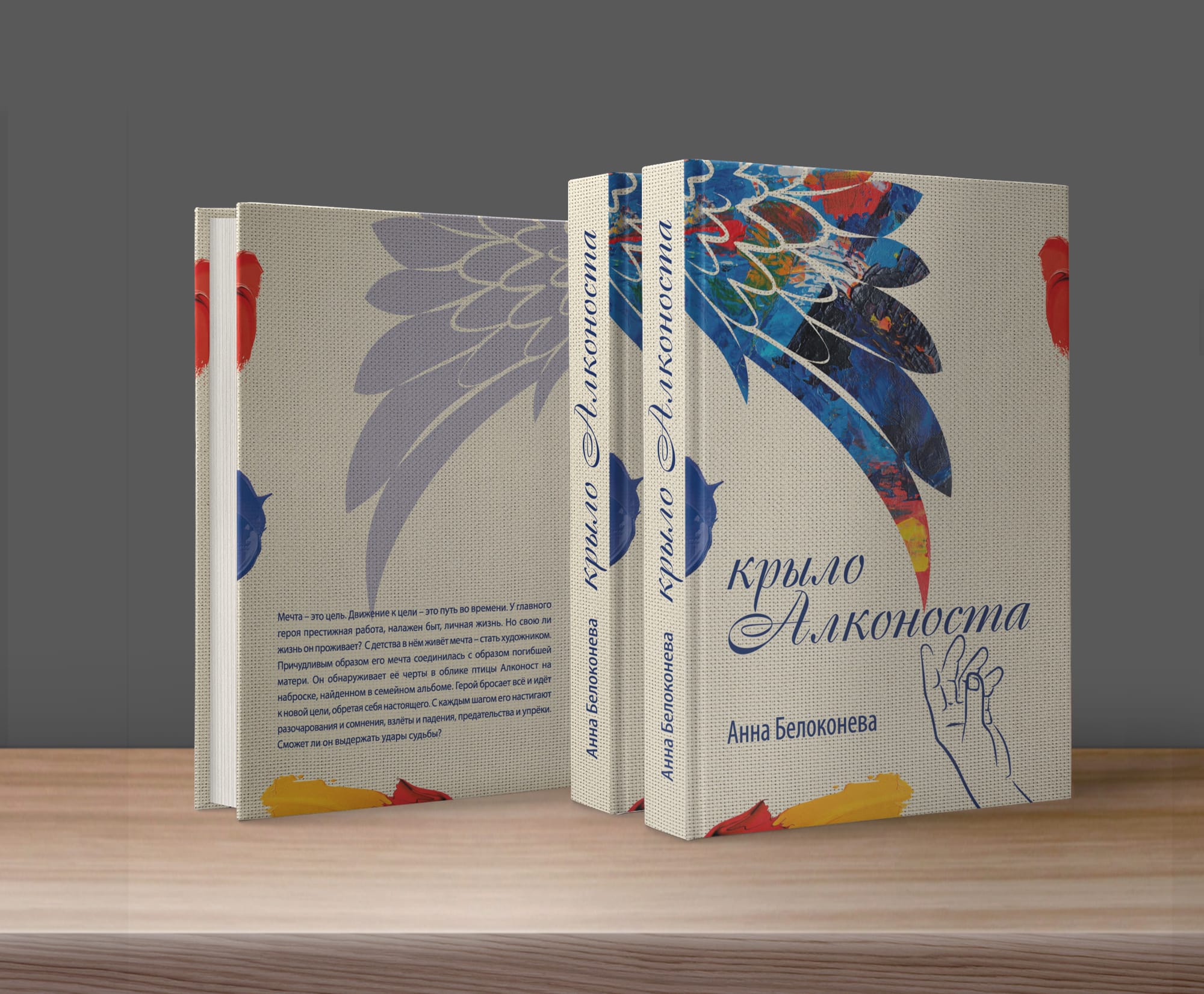В основе дизайна обложки была положена идея: Алконост, протягивая невидимое крыло, помогает и оберегает героя в трудные моменты его пути. Для образности идеи в форму крыла вписаны живописные мазки, что отражает деятельность героя. Для фона обложки использовали фактуру холста с мазками.